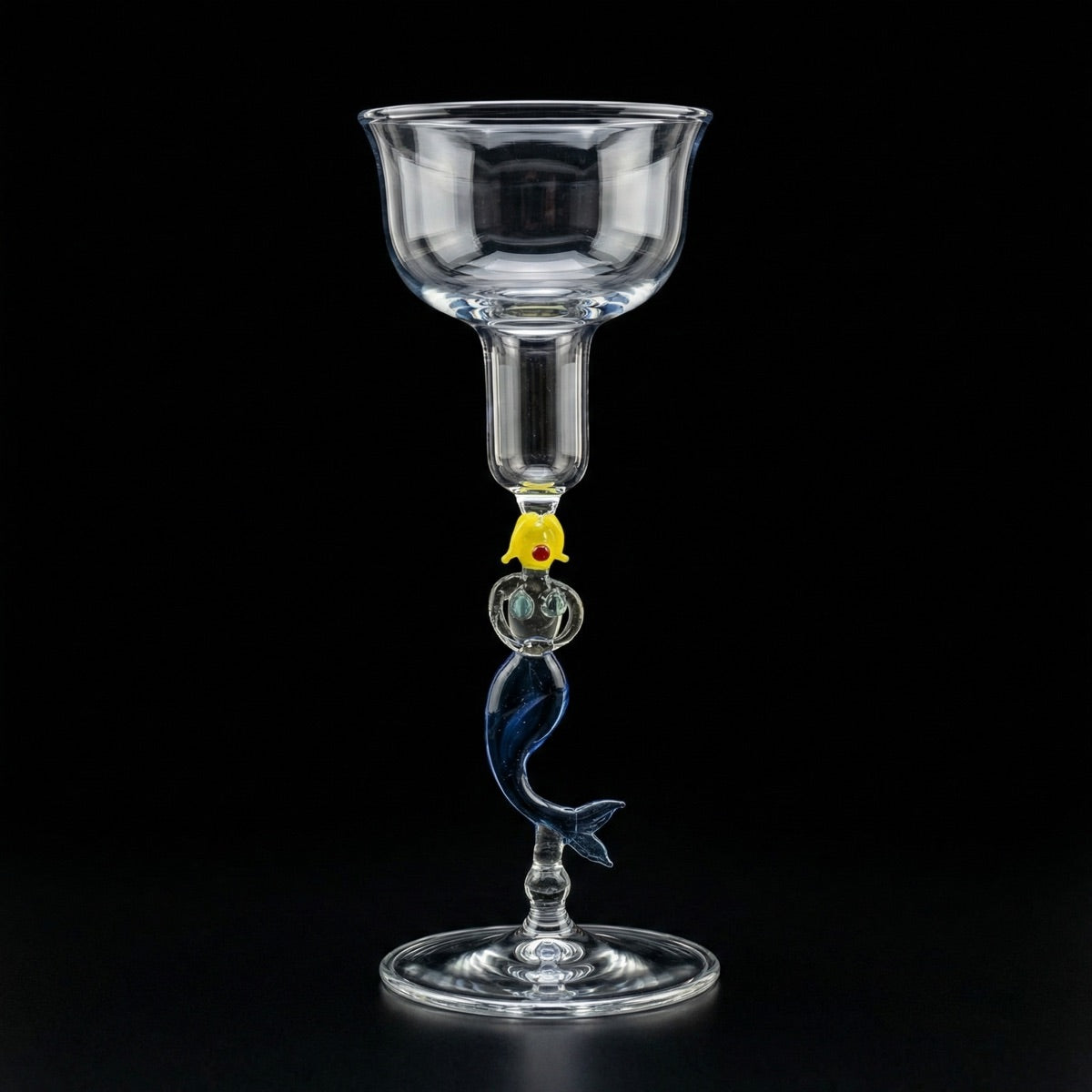 Within its stem lies its world: a mermaid with blonde hair and a deep blue tail, sculpted freehand from borosilicate glass. The wide chalice above is clear and open. A unique piece, without any other version.