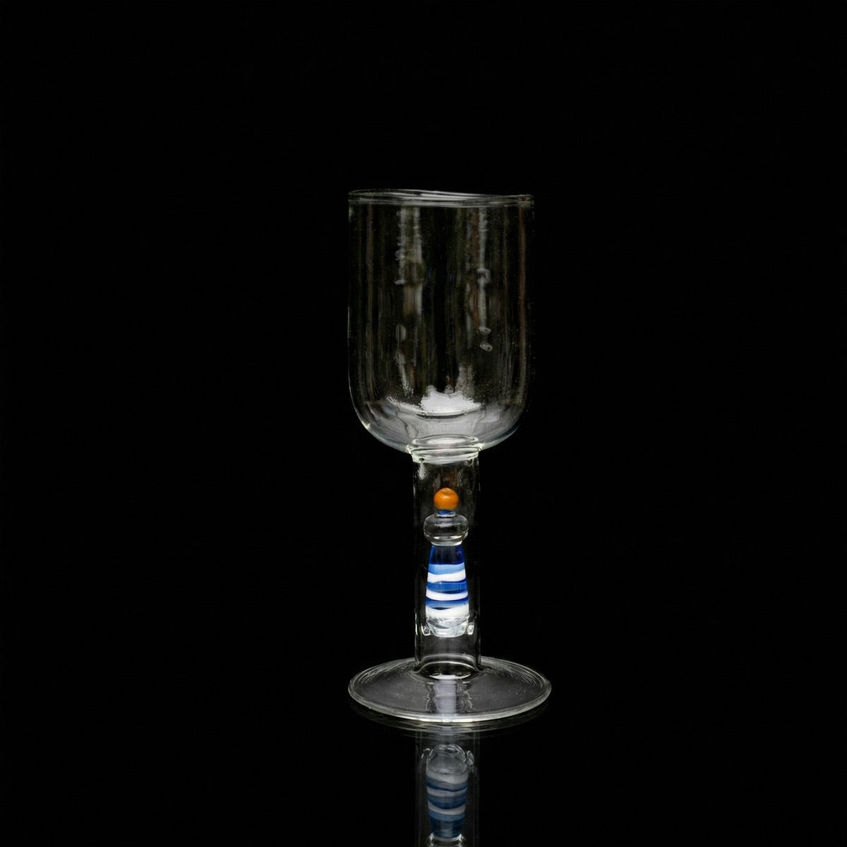 The stem features a lighthouse, striped blue and white or red and white with an orange roof, sculpted freehand. The bowl above is wide and clear. A glass that brings its own horizon.