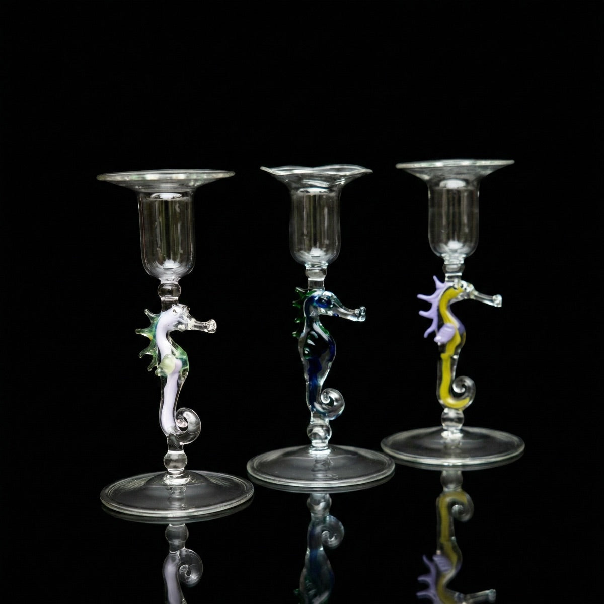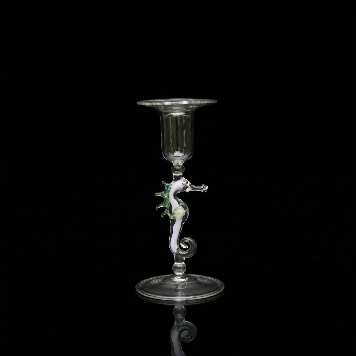 Im Stiel sitzt ein Seepferd, freihand aus farbigem Glas modelliert. Klarer Sockel, klarer Kerzenhalter, dazwischen ein kleines Meerestier. Mundgeblasen und handgemacht in Deutschland, jedes Exemplar ein Einzelstück.