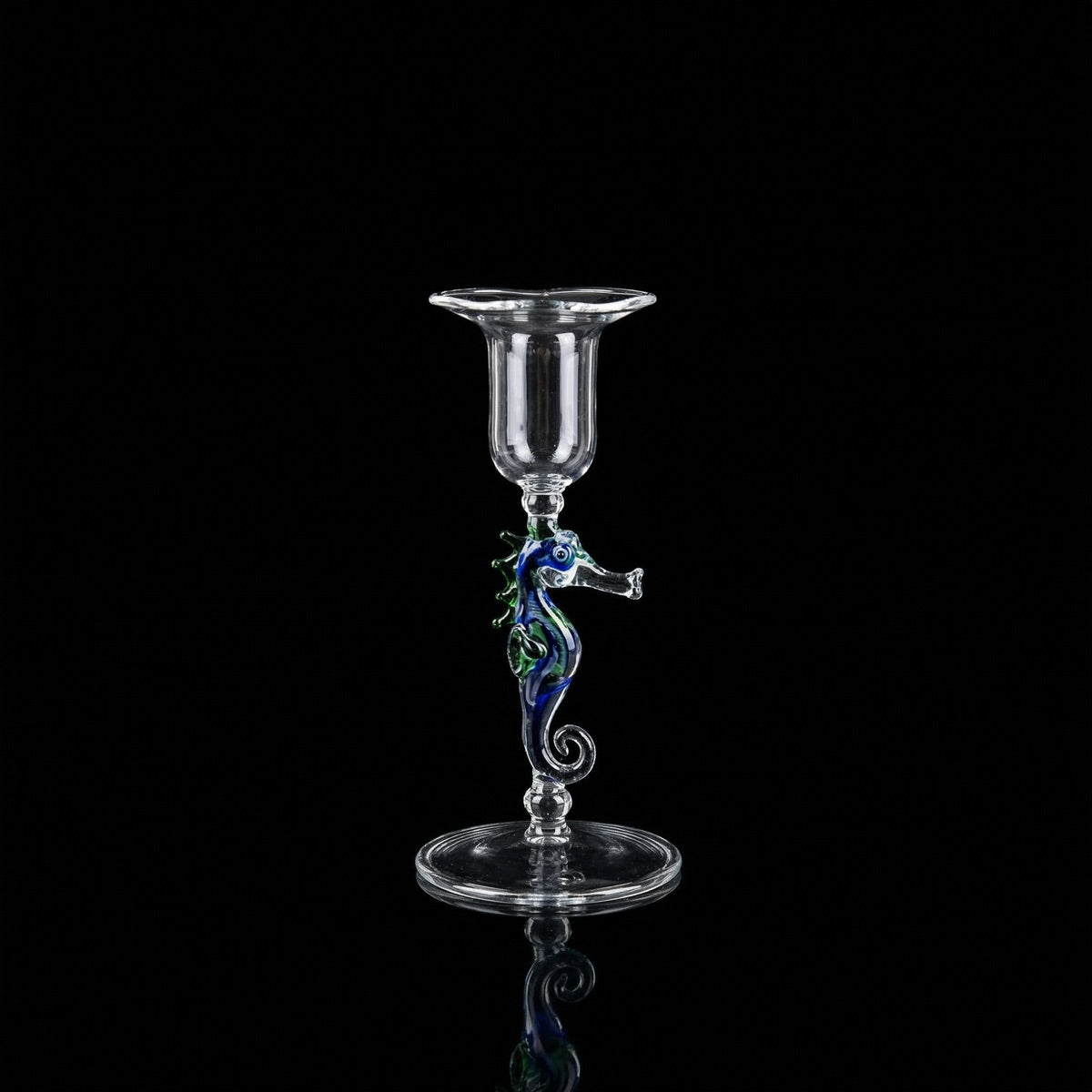 Im Stiel sitzt ein Seepferd, freihand aus farbigem Glas modelliert. Klarer Sockel, klarer Kerzenhalter, dazwischen ein kleines Meerestier. Mundgeblasen und handgemacht in Deutschland, jedes Exemplar ein Einzelstück.